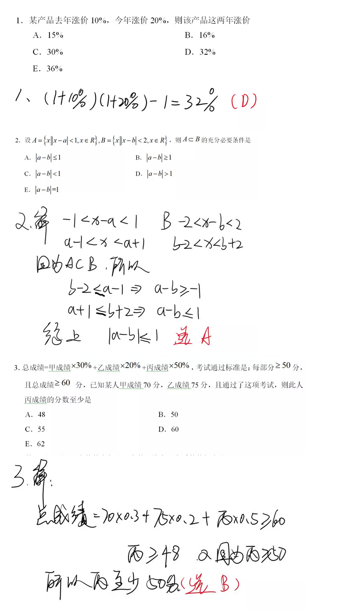 2020年MBA/MEM管理类联考数学真题答案及解析