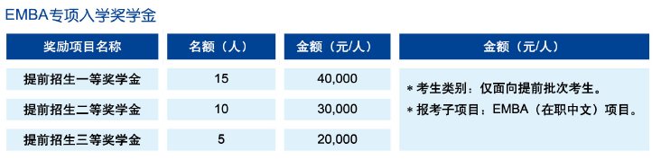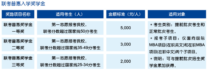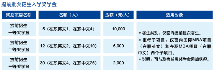 设立三种类别入学奖学金,以资鼓励报考我校MBA项目、全国联考初试分数成绩优秀、提前批次招生面试表现出色的考生。