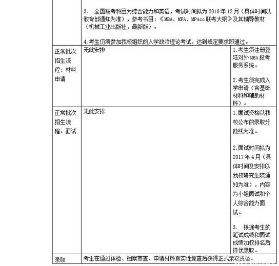 4. “MBA提前批次招生”将安排于2016年5月至11月进行,参加提前批次招生的考生需在联考报名前的指定期间内在线提交申请材料,经过材料评审,择优给予面试资格;经过面试给予综合素质优秀的考生“附条件录取”资格;原则上,该类考生参加全国联考成绩达到国家A线即可录取。