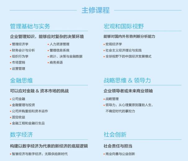 长江商学院MBA项目结合学院的差异化优势,在基础核心课程之外,还围绕金融与投资、智造创业、文创产业三个最具潜力的赛道以及综合管理方向, 开设了丰富的选修课程,并通过多样的行业实践课程使同学保持对行业前沿趋势的敏锐度,通过特色的海外课程提高同学的视野、实现资源跨界整合, 用多元的行业 讲座和实景案例课堂给学生提供更充实的学习体验。
