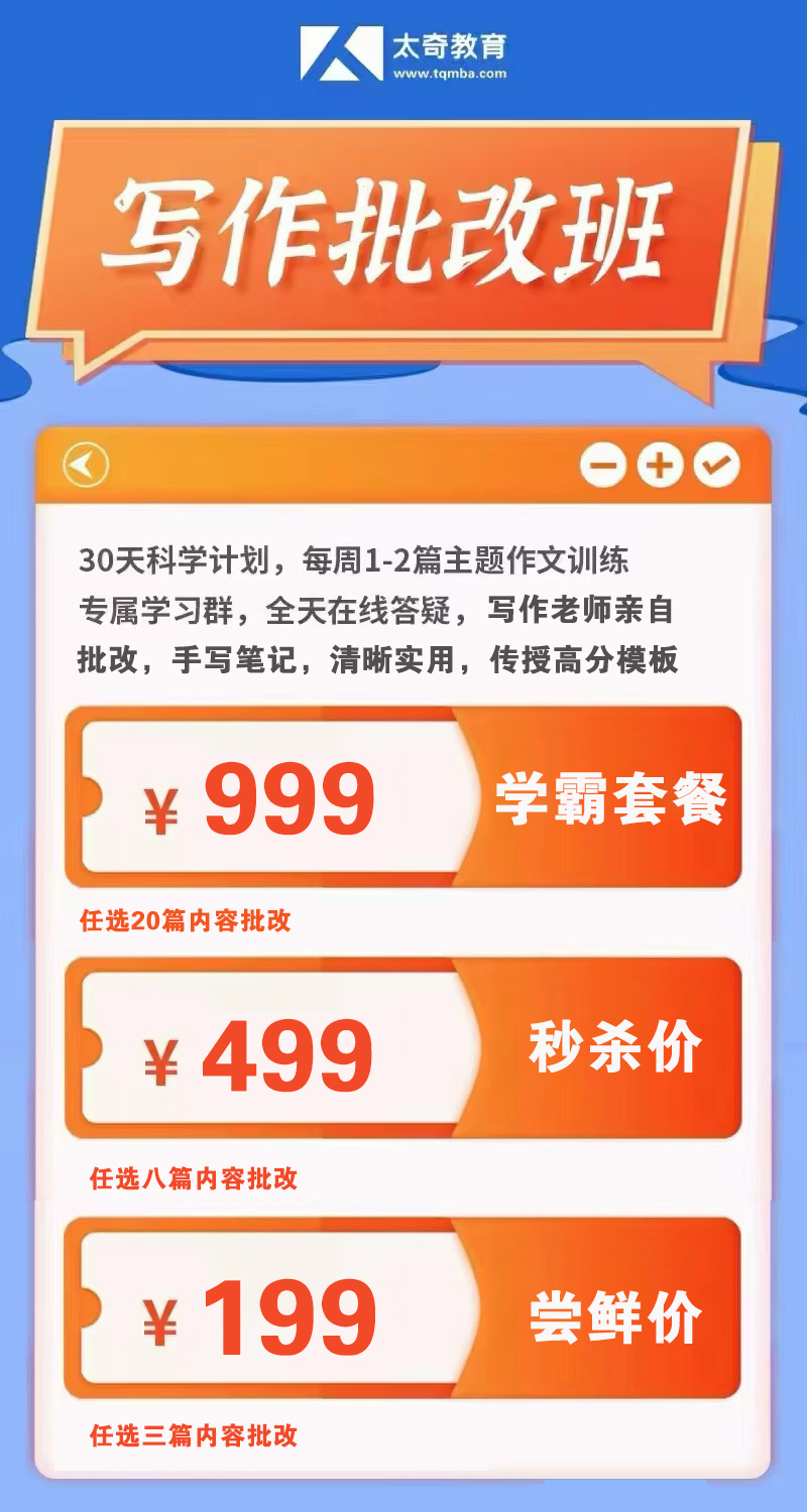 太奇写作批改班也同步上线,为考生最大化模考收益,特聘请多位专业写作老师判卷,1V1精讲,需要的同学请咨询太奇老师